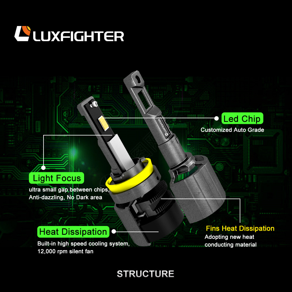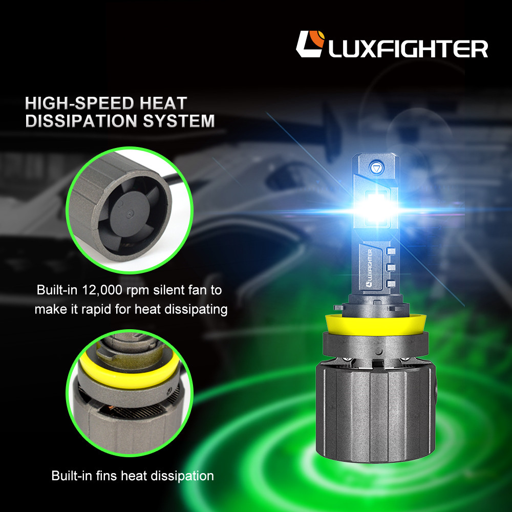 3. Hármas hőeloszlású kialakítás: 12 000 fordulat / perc hűtőventilátor és 90 fokos forgó termikus folyadék, ezek a hőeloszlású tervek a Luxfighter H7 LED lámpának élettartamát meghaladják az 50 000 órát.